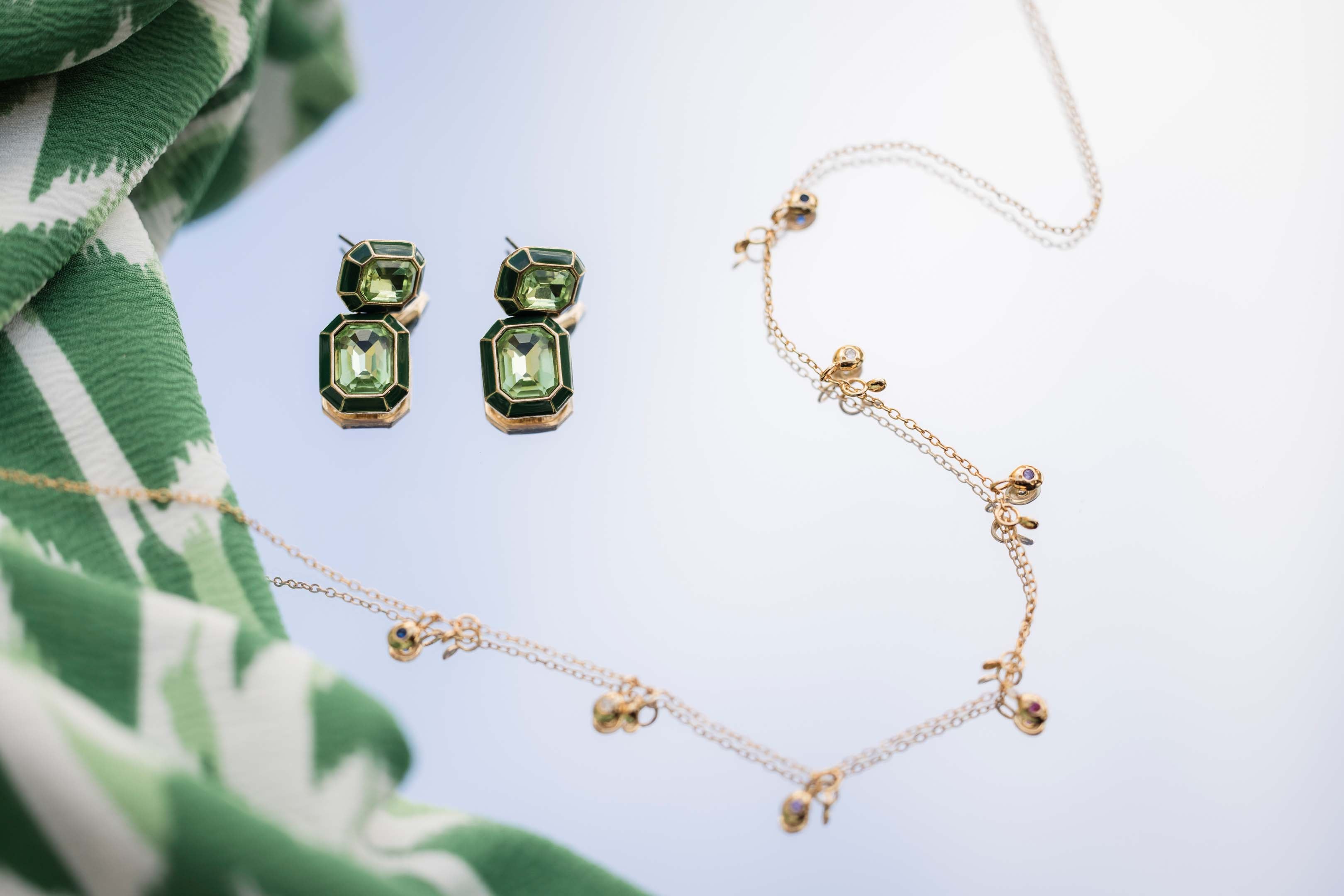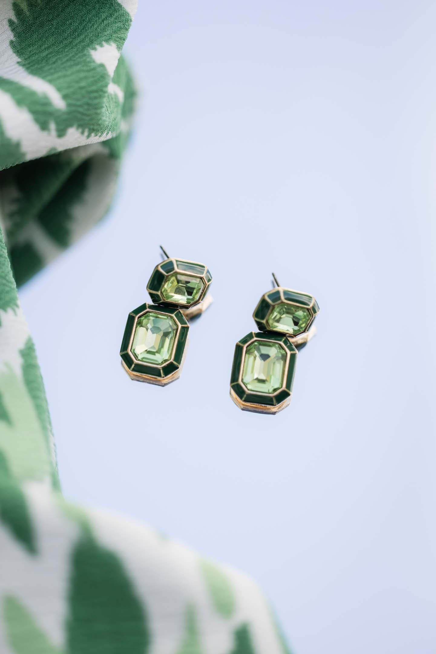 Add a touch of elegance to your outfit with our Double Green Crystal Drop Earrings. Featuring two stunning green crystals, these earrings are perfect added glam for your special outfit.
