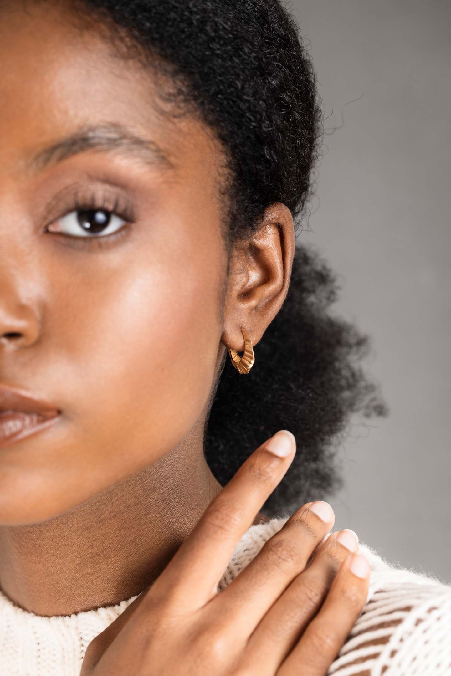 Elevate your earring game with our 18ct Gold Plated Ridged Huggie Hoops. These sophisticated hoops feature a unique ridged design that adds a touch of fun to any outfit.