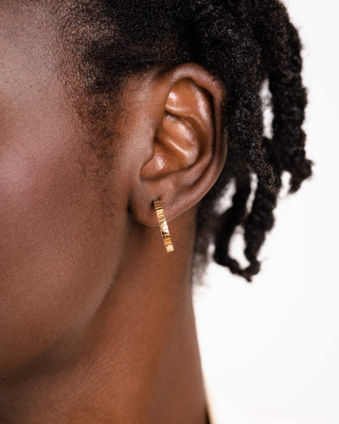 This classic and timeless 18ct Gold Vermeil Ribbed Hoop is perfect for everyday wear. Its ribbed design adds a modern touch. Add a subtle hint of luxury to your look.
