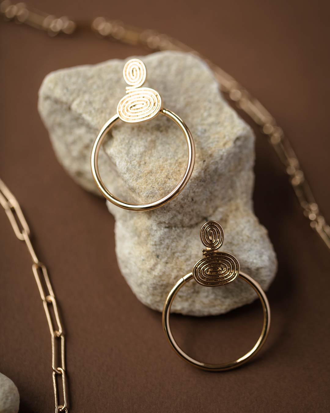 Make a statement with these stunning Gold Spiral Drop Studs. An ethnic detail and large ring create an eye-catching design sure to turn heads.